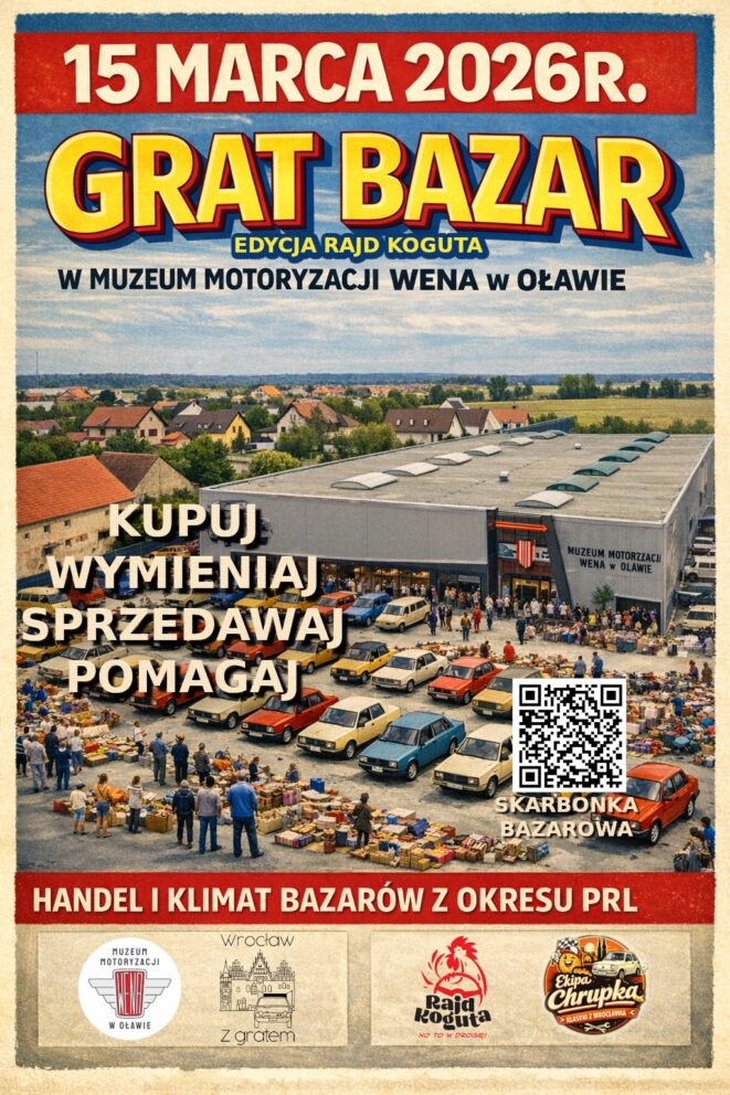 Już wkrótce parking Muzeum Motoryzacji WENA zamieni się w prawdziwy motoryzacyjny bazar w klimacie PRL i lat 90. Przed nami wyjątkowa edycja GRAT BAZARU – Rajd Koguta, która połączy pasję do klasycznej motoryzacji z realnym wsparciem fundacji WENA.